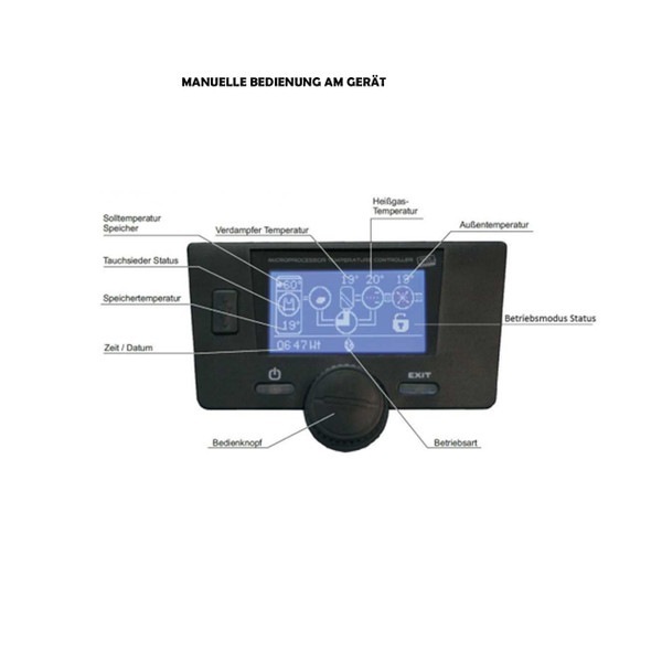 Regelung und Steuerfunktionen: Die Standard-Regelung „M“ bietet ein grafisches Display zur direkten Bedienung. Sie erlaubt die Programmierung eines Wochenplans zur gewünschten Wassertemperatur. Funktionen wie automatischer Frostschutz und Abtauung des Verdampfers über Heißgas sind ebenfalls integriert.